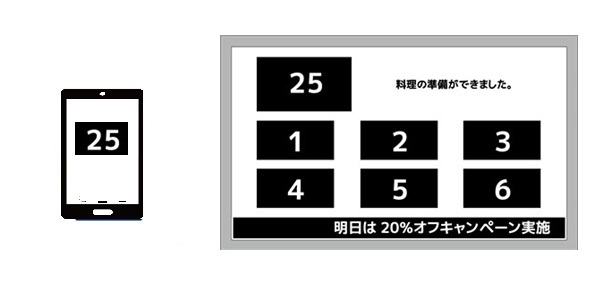 呼び出し番号表示システム「ワンタッチビュー」と一緒に使用すると、モバイルオーダーによるテイクアウト注文のお客さま番号をモニターに表示させることができます。スタッフはお客さまを呼び出すことに工数を割くことなく、スムーズにテイクアウト商品をお渡しできます。