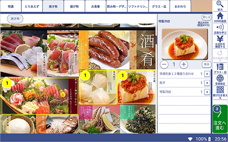 セルフオーダーシステム「FoodFrontia St」は、買い物カゴ仕様でサクサク注文、端末グルーピング設定、品切れ・取扱中止の登録、メニューNo入力、おかわり機能など、さまざまなオーダー入力の機能を搭載しています。