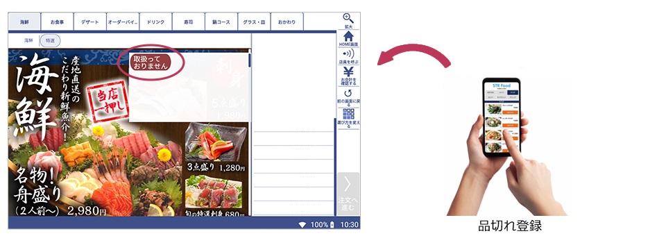 品切れ・取扱中止の登録で、在庫切れメニューなどの注文をストップ