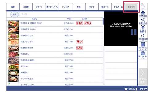 動画で料理の美味しさをアピール、最初の画面に販促動画を表示、スクリーンセーバーによる販促機能など、さまざまな動画・販促表示の機能を搭載しています。