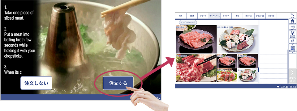 海外からのお客様向けに、しゃぶしゃぶやざるそばなど、食べ方の説明が難しいメニューも、動画を流せばスムーズにご案内できます。