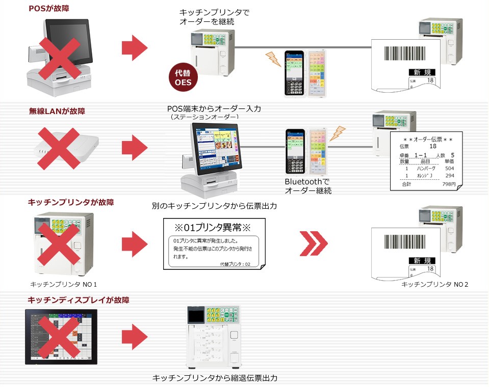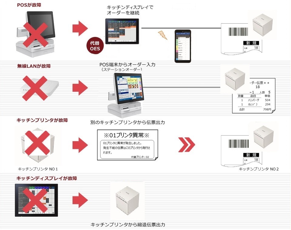 ホールとキッチンの業務継続性を追求し、オーダーエントリー代替機能をキッチンプリンタに内蔵(オプション)。 障害発生時にも代替運用が可能なノンダウンオペレーションシステムのため、安心して運用いただけます。