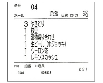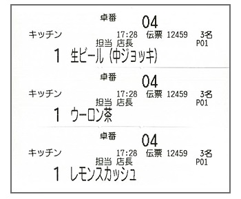 チケット伝票は単品ごとに出力できる短冊状の伝票です。 注文されたメニューを調理ポジションごとに出力し、素早く料理に取りかかることができます。また卓番が印字されるので、調理後もスムーズな提供が可能です。