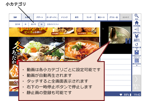 メニューの小カテゴリごとに、おすすめのメニューの動画を流すことができます。