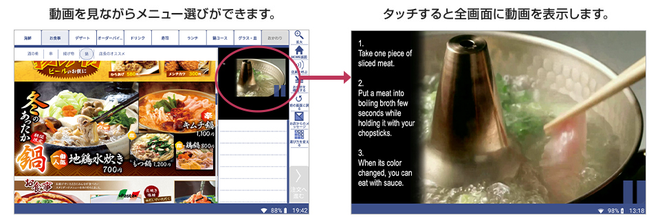 「どうやって食べるかわからない」、「正しい食べ方を知りたい」というお客様のために静止画や動画で食べ方を紹介することができます。外国語に不慣れなホールスタッフが食べ方を質問された場合にも、セルフオーダー端末で説明できるので安心です。 また、近隣の観光スポットや地域特産品なども紹介すれば、お客様に喜ばれ、お店のファンを増やすことができます。