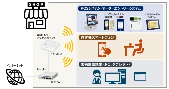 オーダーエントリーシステムの導入により構築した店舗内の無線LAN環境をお客様にも開放することで、店舗内で公衆無線LANスポットサービスを提供することができます。さらに、勤怠管理や受発注システムなどの店舗業務用ネットワークとも共有化を図ることができ、システム導入のコストダウンを実現します。