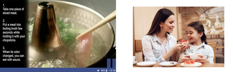 - 多言語の静止画や動画で、料理の楽しみ方や豆知識、食べ方などを表示することができます。