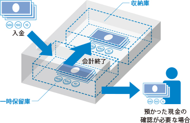 釣銭機内の現金を自動で再計数する機能を備えており、点検作業や現金棚卸業務の効率化に貢献します。