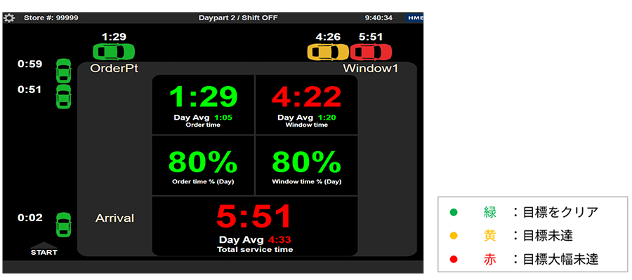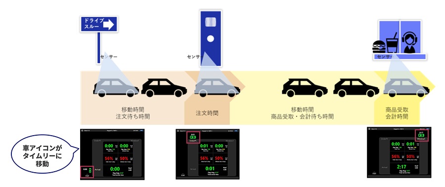 ドライブスルーのオーダーポストや商品受け渡し口付近に設置されたセンサーで車両を検知。リアルタイムで車両位置や各エリアの滞在時間、サービスタイムなどを専用モニターに表示し、オペレーションの改善を支援します。