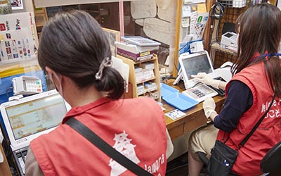 またPOSシステムの導入に当たり、施設内では既存のWi-Fiを利用できましたが、城跡が文化財指定になっていることもあり、各施設間をつなぐ新規LAN敷設工事は難しい状況でした。そのため、天守閣の管理用サーバに他2施設のデータをUSBメモリ経由で登録する方法を採用、データは自動集計され再入力などの手間がかからない点も、業務の効率化につながっています。