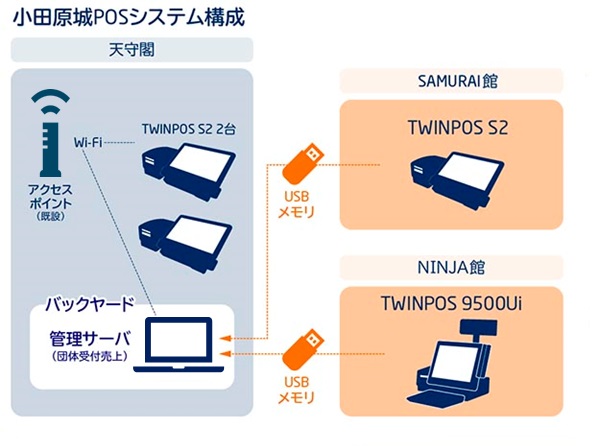 今回、NINJA館にTWINPOS 9500Ui 1台と管理サーバ(現在は天守閣に移設)、天守閣とSAMURAI館にタブレットタイプのTWINPOS S2 3台の合計4台を導入しました。