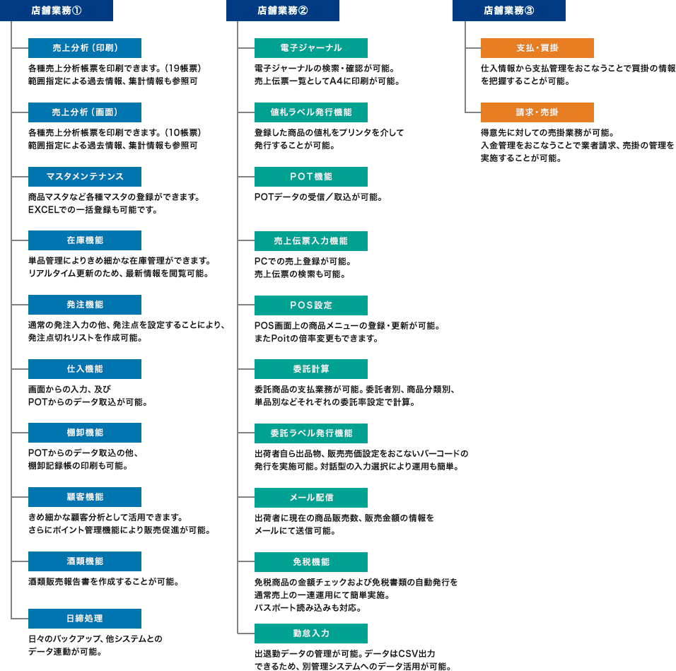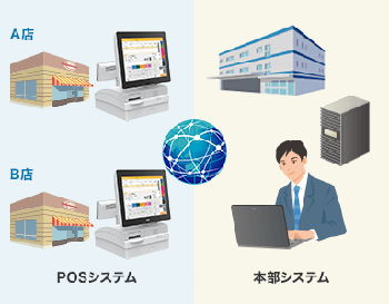 本部機能は各店舗からの情報(売上、仕入在庫、棚卸、発注、顧客ポイント情報など) が一元管理されておりDB公開も可能なため、基幹システムとの連携が容易に可能です。