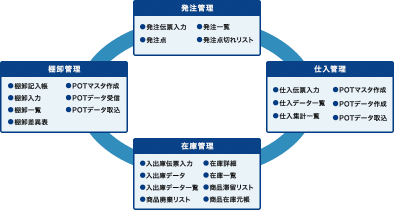 店舗の在庫管理に必要な機能(発注、仕入、入出庫、棚卸、在庫管理)を搭載し、きめ細かな在庫管理を実現します。