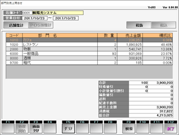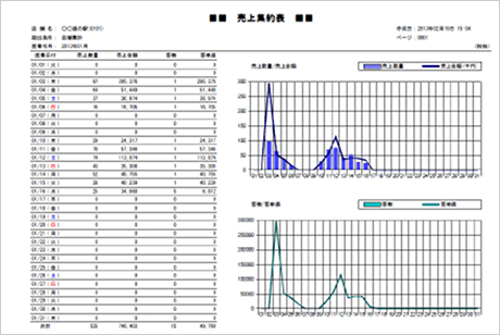 売上分析によって、各店舗の指定期間の売上金額、値引金額、割引金額、粗利金額や、部門別・商品別の売上情報を把握することができます。