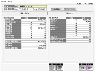 店舗コード、営業日付を指定することによって、帳票を出力することなく、店舗ごとの売上集計結果を画面上で確認することができます。画面確認は帳票のイメージのほか、グラフでも表示することができます。