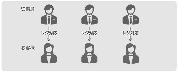 「対面型セミセルフ」とは、従業員が商品スキャンと袋詰めを行い、来店されたお客さま自身が支払いを行う仕組みです。商品の袋詰めと支払いを並行して進めることで、従業員会計に比べて1人あたりの会計時間を短縮。それにより、レジ待ち時間の短縮につながります。また、少人数のスタッフで会計対応できる客数が増えるため、人手不足対策に貢献します。