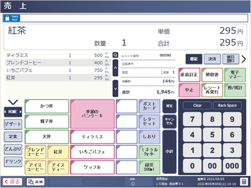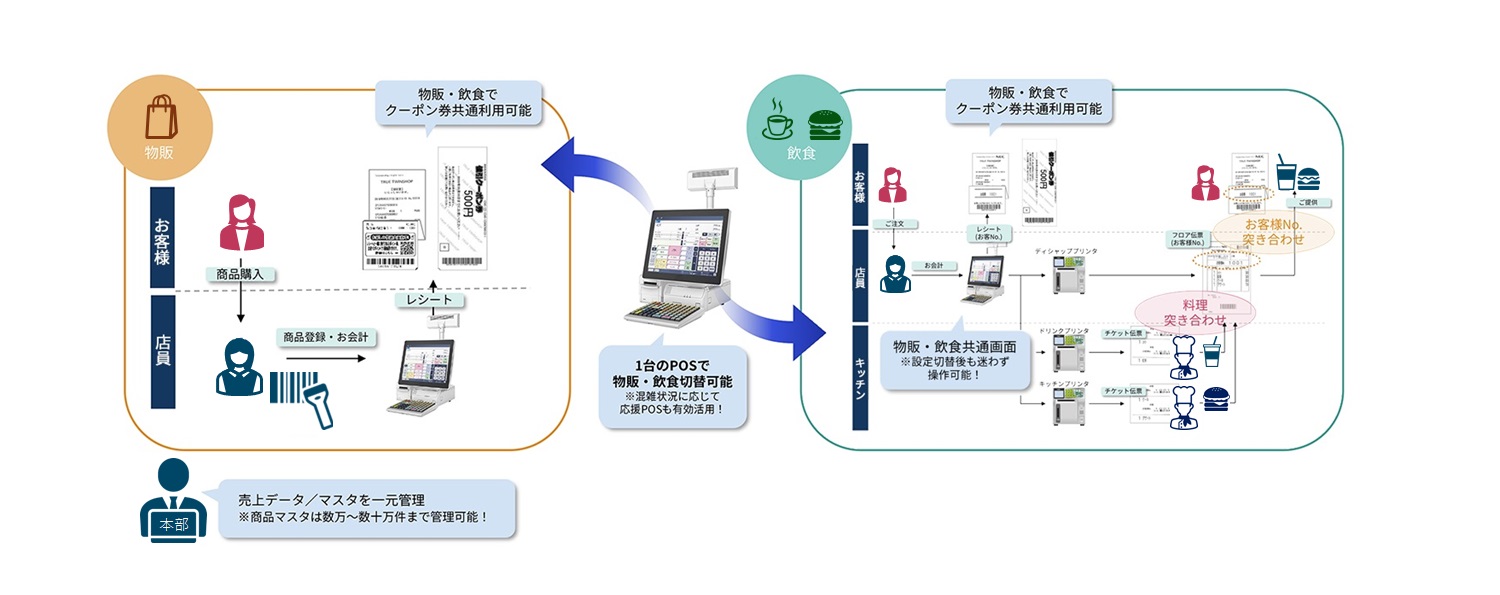 「TRUE TWINSHOP」は1つのシステムで物販機能と飲食機能に対応しています。統一されたシステムなので、店舗スタッフは物販レジ、飲食レジの操作に戸惑うことなくPOSを操作でき、店舗業務の効率化を支援します。