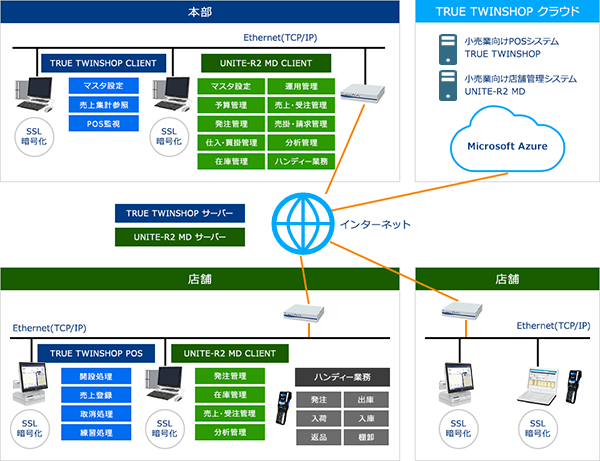 「TRUE TWINSHOP クラウド」は、店舗管理システム「UNITE-R2MD」と連携し、小売店の業務をトータルにサポート。各店舗のPOSデータをリアルタイムに収集・分析することができ、売上管理や在庫の適正化を支援し、効果的な販売戦略の立案に貢献します。