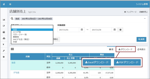 店舗(パターン設定可)と期間を設定し、月別、曜日別、日別に 各種データ(客層、時間帯、担当者、店舗、部門、商品)を表示。 表示項目の設定やデータ出力機能(EXCEL、PDF)により、 効率よく確認を行うことができます。
