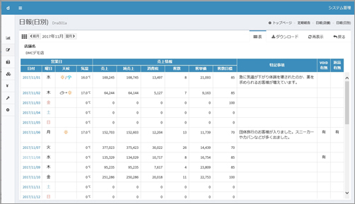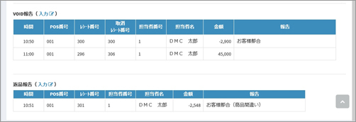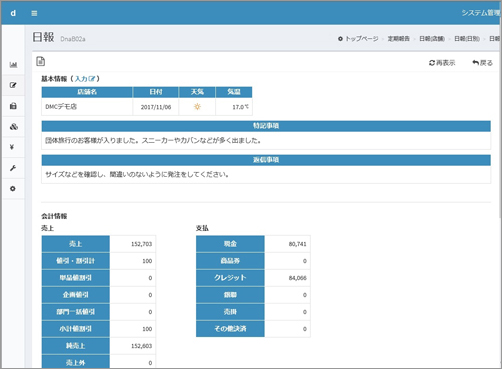 店舗別、日別に日報作成が可能です。売上情報や支払情報が行え、 各処理については内容報告の入力ができます。
