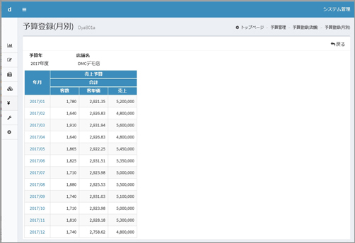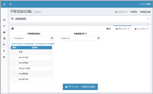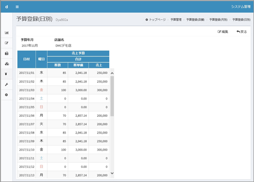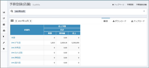 日別売上の予算(客数・客単価・売上)の登録が行えます。 登録した予算は、売上分析の予算に表示されます。画面からの登録のほか、EXCELでの一括アップロードとダウンロードができます