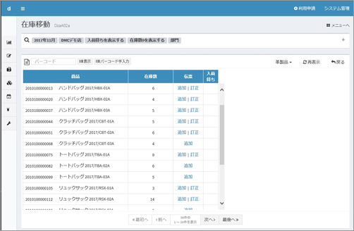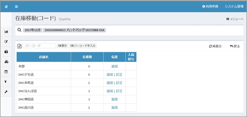 仕入による入庫、廃棄による出庫や店舗間での移動の伝票を入力し、在庫数の管理を行います。複数店舗管理時には、各店舗の在庫数(指定した1商品)が 一覧で確認可能。店舗間の移動時には、出庫入力が完了すると「入庫待ち」状態になり処理待ちの在庫確認ができます。