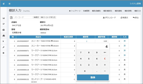 棚卸入力は、バーコードもしくは手入力で商品を指定して入力する方法と在庫場所別に一覧表示し入力する方法があります。棚卸入力後、確定処理を行うと入力した数量が帳簿在庫数になります。