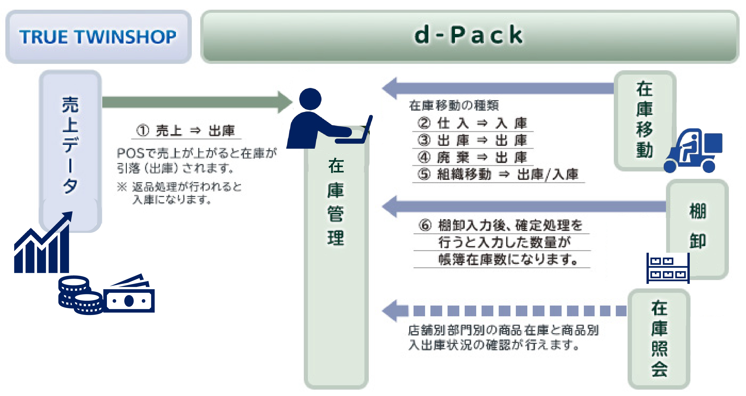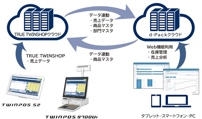 「TRUE TWINSHOP クラウド」との連携により、当日の売上データを確認できます。また、売上データより在庫の引き落としを行うため、リアルタイムで在庫数を確認できます。